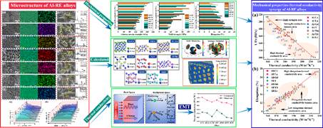 近日,材料科学与工程学院、省部共建有色金属先进加工与再利用国家重点实验室李元东教授团队在国际TOP权威期刊《Journal of Materials Science & Technology》(中国科学院一区,IF:14.3)、《Materials & Design》(中国科学院二区,IF:7.9)和《Transactions of Nonferrous Metals Society of China》(中国科学院一区,IF:4.7)上连续发表三项高强高导铝合金材料重要研究成果,系统揭示了铝合金中强度与导热性能的协同调控机制,为高导热高强铝合金的设计提供了新思路与方法。所有研究成果均以j9.com为第一完成单位和唯一通讯单位,李元东教授为唯一通讯作者,刘文憬博士为第一作者。