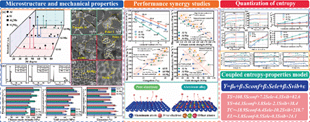 研究团队创新提出融合电子熵、构型熵与振动熵的“多熵耦合”设计框架理论,结合第一性原理计算与实验验证,系统揭示了Al–Si、Al–Mg及Al–Mn三种合金体系中熵参数对性能的影响机制。研究表明,构型熵是提高合金强度的关键因素,而电子熵与振动熵通过增强电子-声子散射显著降低导热率。