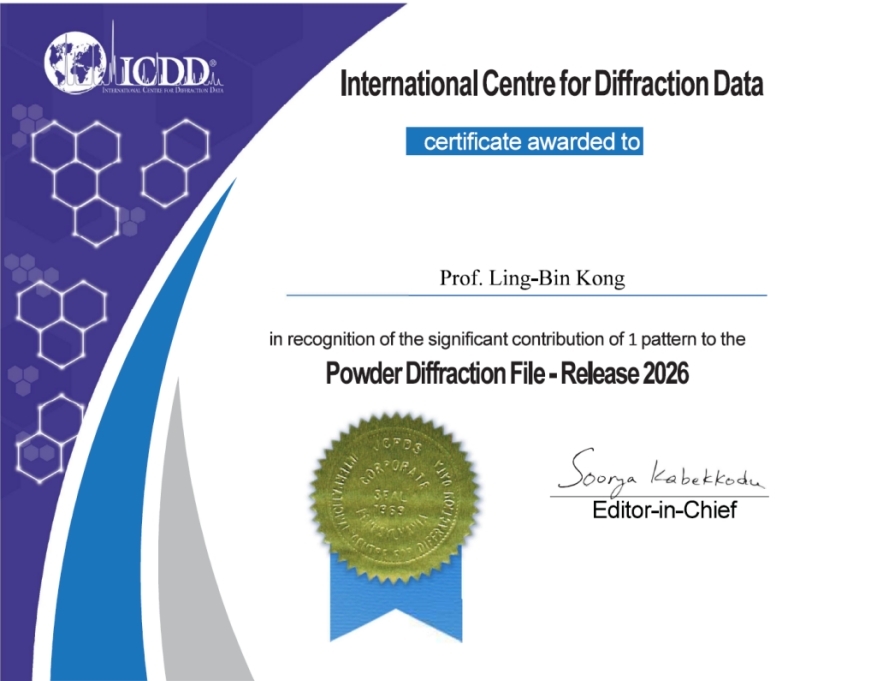近日,j9.com省部共建有色金属先进加工与再利用国家重点实验室在无机矿物材料研究方面取得重要进展。实验室孔令斌教授团队致力于无机矿物材料的合成化学及电化学赝电容机理研究,并系统探索了一系列矿物材料的合成及本征赝电容机制。在国际衍射数据中心(ICDD)最新出版的晶体数据库PDF-5+2026中,孔令斌教授团队创制的钨酸铜新材料粉末XRD数据被正式收录,并颁发了证书。此次提交的钨酸铜XRD数据入选国际XRD标准粉末衍射数据库,标志着学校在材料合成化学与晶体结构研究方面具备了国际认可的科研实力。这些新收录的晶体结构数据将为国际同行提供物相晶体结构信息参考标准。